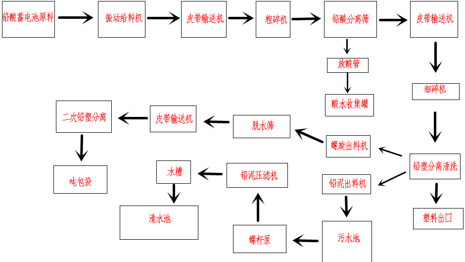 鏟車將廢舊電瓶放入振動給料倉,經(jīng)振動料倉均勻進入上料運送機,運送機把電瓶送入雙刀粗碎機,粗碎機通過雙刀將電瓶破碎至30mm左右寬度的條狀塊,落入下面的鉛酸振動分離機,電瓶里的酸會落入下層收集器,通過管道送入酸水收集罐集中處理,鉛和塑料通過上層篩網(wǎng)進人二次細碎運送機,運送機把鉛和塑料送入細碎機,細碎機加水通過錘片對物料進行細碎,加水的作用是利用細碎機錘頭,在轉(zhuǎn)動破碎時更充分的對鉛塑清洗分離,達到粒度的鉛塑.通過細碎機篩孔隨水一塊進入鉛塑分離機,通過水的重力分選鉛和塑料,塑料漂浮在水面被撥輪撥到前面出塑口落下收集,鉛的比重大會沉入水底,經(jīng)螺旋出料機將鉛粒拉出送入滾筒脫水機,鉛泥會落入前面的出水口進入沉淀池,經(jīng)螺桿泵送入壓慮機進行壓慮脫水,鉛泥會被壓慮機過濾,等待和鉛混合壓餅加工,水流入過濾水池,經(jīng)水泵再送入破碎機循環(huán)使用,脫水后的鉛里會含有比重大的塑紙和重塑,經(jīng)運送機再送入負壓風(fēng)篩經(jīng)二次分離,塑料和塑紙會被風(fēng)抽走,比重大的鉛會落下來進入收集器收集,破碎系統(tǒng)全程工作流程,無廢水流出污染環(huán)境,鉛會再次加工,塑料也會再次回收利用,采用水介質(zhì)分離避免了工人在生產(chǎn)過程中的鉛中毒,減輕了工人的勞動強度。另一方面,把板柵材料和鉛泥分開,提高了爐料的鉛品位,從而減少了煙氣、棄渣和煙塵數(shù)量,減少能耗,提高金屬回收率、工效和產(chǎn)能,有利于環(huán)境保護 。